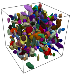 内容:砂土颗粒的形态对其力学性质有着显著的影响。CT扫描可直接获取真实砂土颗粒的形态,但所获得的数量往往有限,因此如何生成大量保留真实颗粒(母颗粒)形态信息的虚拟颗粒,是利用离散元模拟方法研究颗粒细观形态特征对宏观力学特性影响规律的基础。然而,现有的颗粒生成方法大多仅适用于轴长比和棱角度分布较为狭窄的母颗粒。针对此问题,本文提出了一种能够保留母颗粒较大范围轴长比和棱角度(如图1所示)的形态和级配信息的虚拟颗粒生成方法。