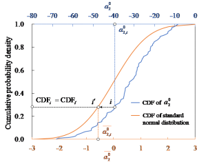 图2 颗粒生成的基本框架:(a)系数标准化;(b)随机生成的标准化系数分布;(c)系数转换;(d)随机生成的虚拟颗粒系数分布