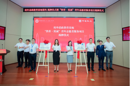 仪式现场,深圳大学土木与交通工程学院与中建科工深圳公司签订合作协议,左英姿与段海、陈碧霞与深圳中国钢结构博物馆执行馆长张利锋代表合作双方分别为校外思政教育基地、“铁骨·筑诚”青年志愿者服务项目揭牌。