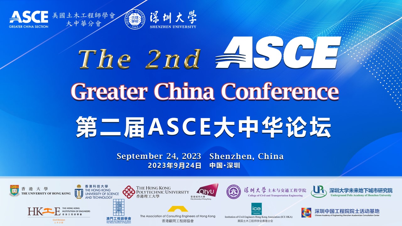 “第二届ASCE大中华论坛”于2023年9月24日在深圳大学举行。本次大会由美国土木工程师学会大中华分会(ASCE Greater China Section)主办,深圳大学承办,香港大学、香港科技大学、香港理工大学、深圳大学土木与交通工程学院、深圳大学未来地下城市研究院等多家单位协办。本次会议由我院院长陈湘生院士担任顾问委员会主席,美国土木工程师学会大中华区主席邓晓蔚教授担任组委会主席,我院副院长苏栋教授担任组委会联合主席,多位院士、大师等一流专家学者出任顾问委员会委员。