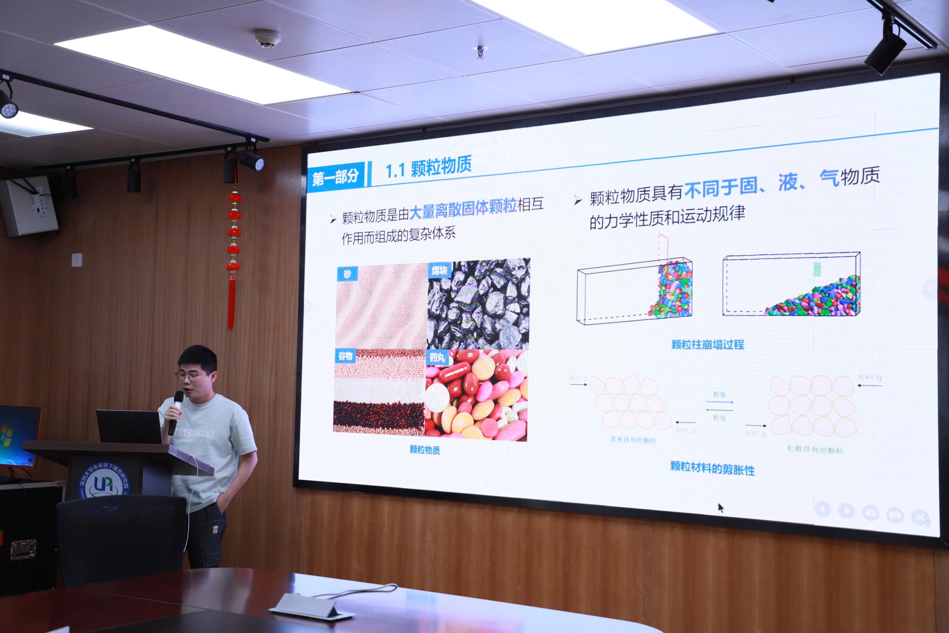 博士生樊猛作了题为《非规则颗粒形态控制生成方法及离散元模拟》,报告介绍了非规则颗粒表面重构以及多层次几何形态评价的基本理论和技术,探讨了形态可控的虚拟颗粒生成广法,进一步展示了颗粒材料堆积与剪切的离散元模拟结果。