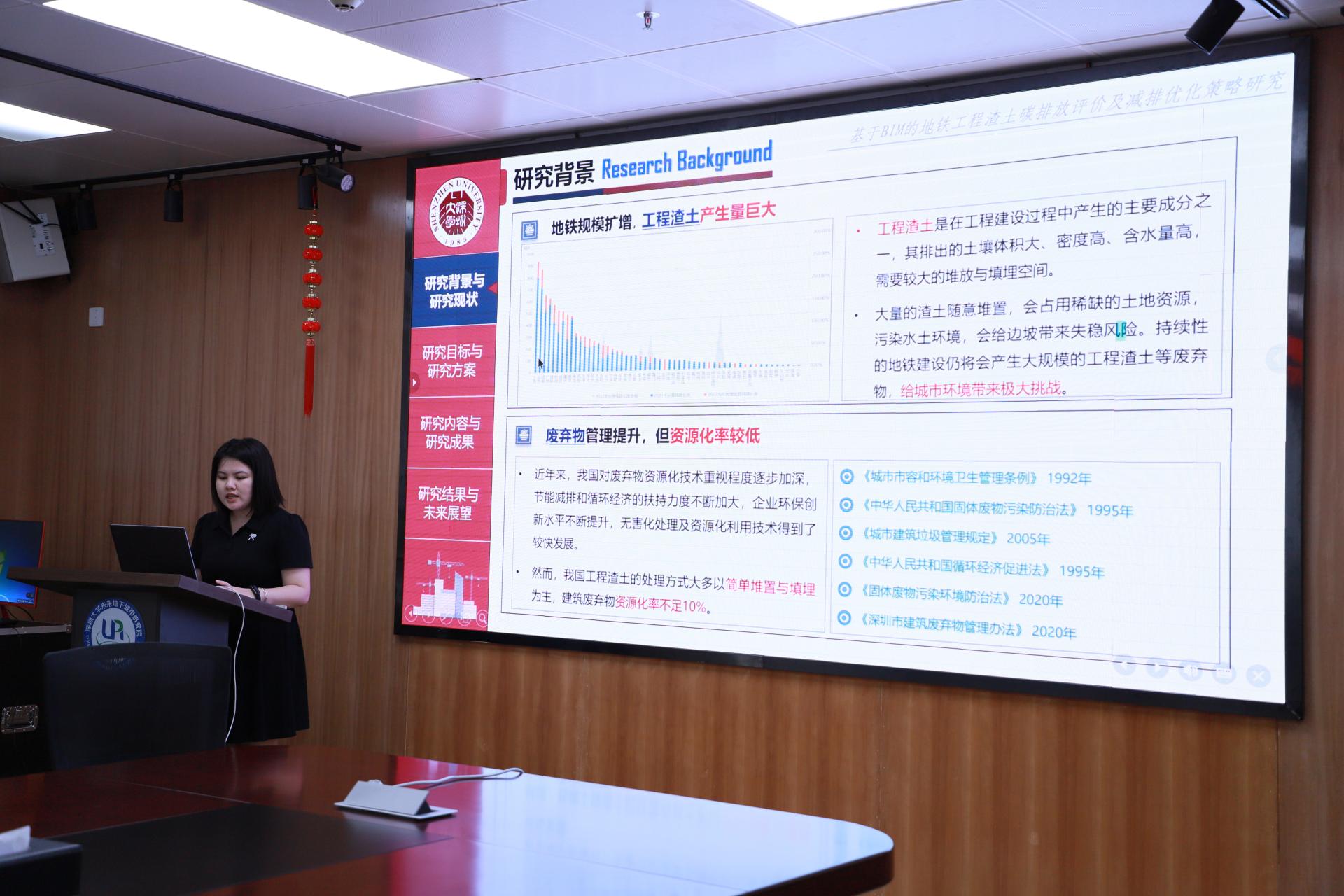 硕士生陆芸作了题为《基于BIM的地铁工程渣土碳排放评价及减排优化策略研究》,报告针对地铁工程渣土展开研究,将BIM技术与生命周期评价相结合,为制定地铁工程渣土可持续管理方案提供可靠依据,促进地铁工程的绿色发展。