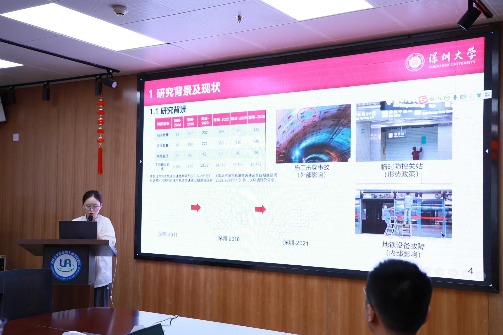硕士生张虹作了题为《基于客流仿真的城市轨道交通运行网络韧性评价-以深圳市为例》,报告基于深圳市轨道交通AFC乘客进出站刷卡数据,通过客流仿真模拟实验获得各扰动场景下的指标数据,通过熵权法和优劣解距离法建立综合评价模型,对城市轨道交通运行网络韧性评估提供了理论依据和定量评估型。