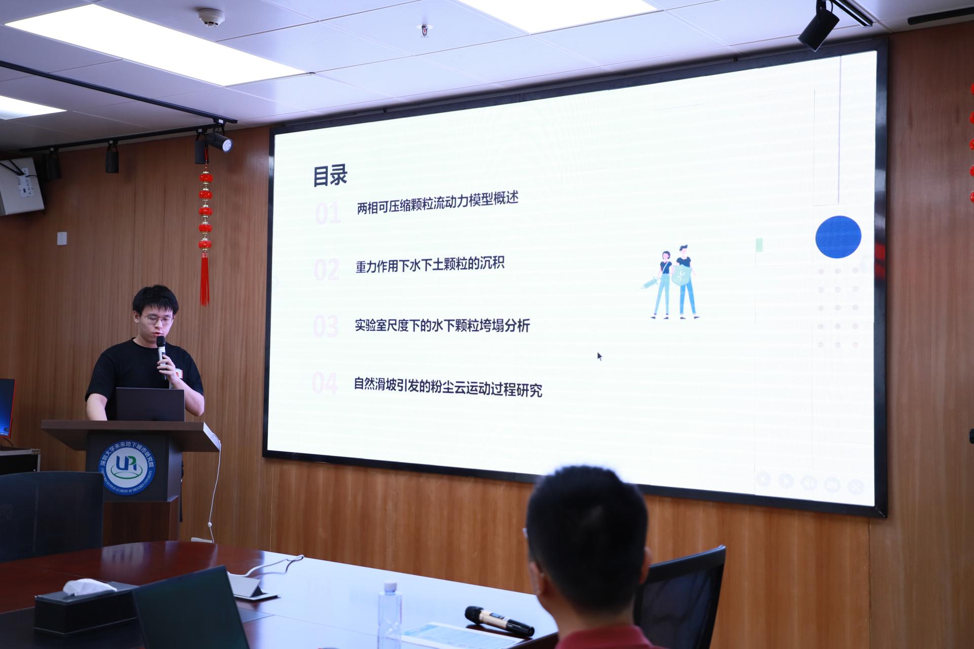 硕士生刘志昊作了题为《颗粒-流体两相动力学模型研究》,研究采用连续介质理论,以可压缩Navier-Stokes方程为基础,针对空气和水两种包裹颗粒的流体环境,构建了颗粒-流体两相动力学模型,对于颗粒沉积过程的刻画和地质灾害分析具有重要意义。