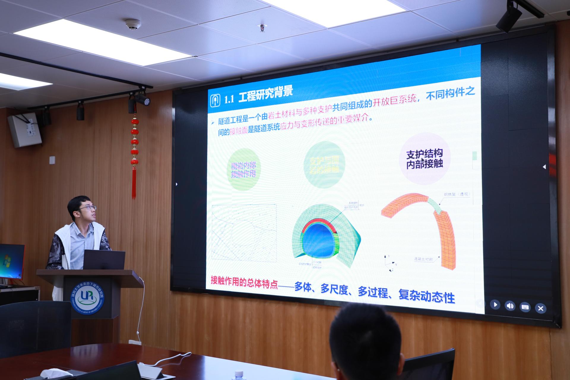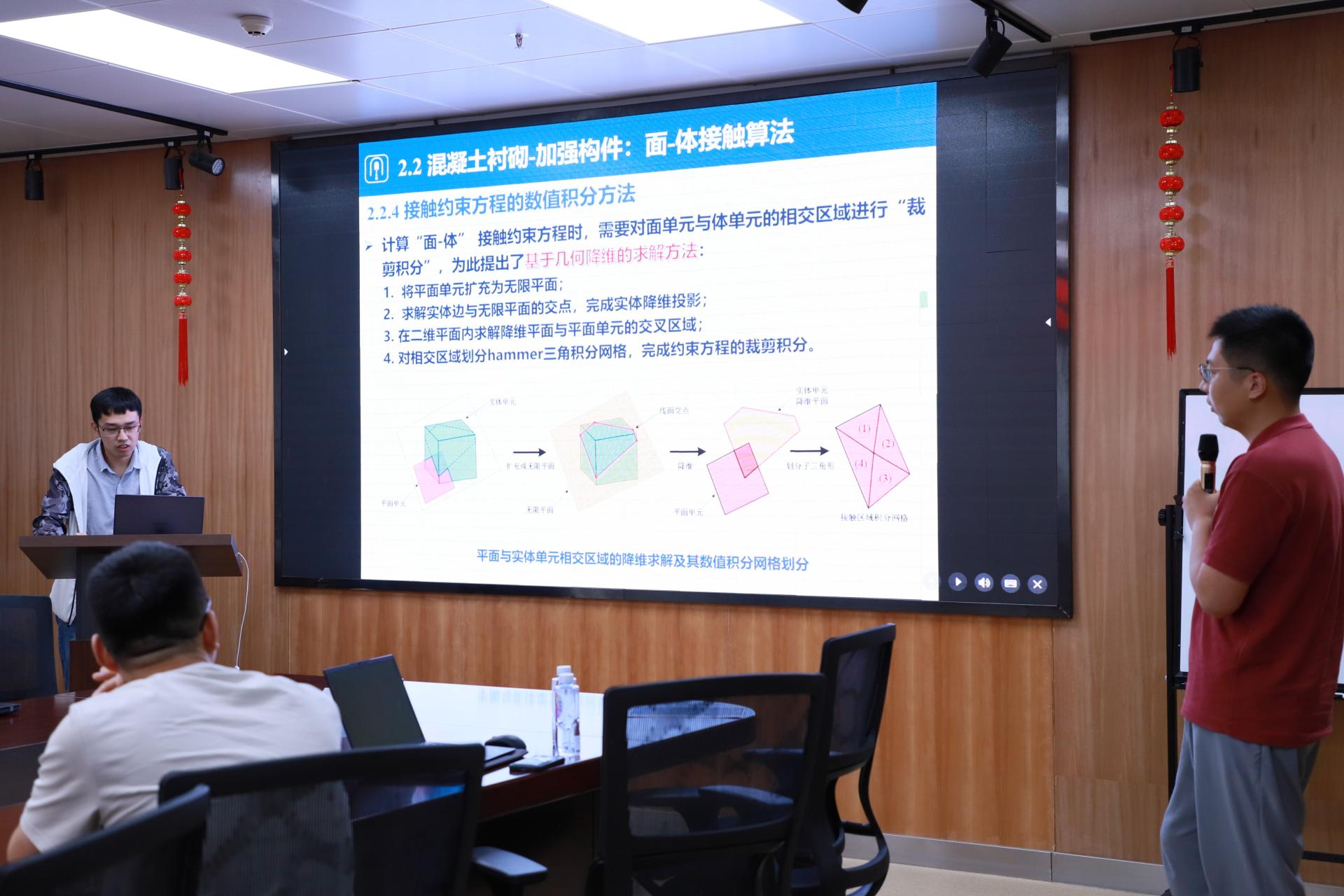 在论坛的学术报告环节,博士后方黄城作了题为《隧道支护-围岩系统的多体接触法》,报告从隧道工程的接触问题出发,探讨不同算法的优劣特性以及高性能接触算法在隧道工程中的实现,着重介绍由汇报人针对不同支护结构所开发的线-体、面-体、面-面以及多体接触算法,同时阐述这些算法在隧道工程多尺度分析中的应用。
