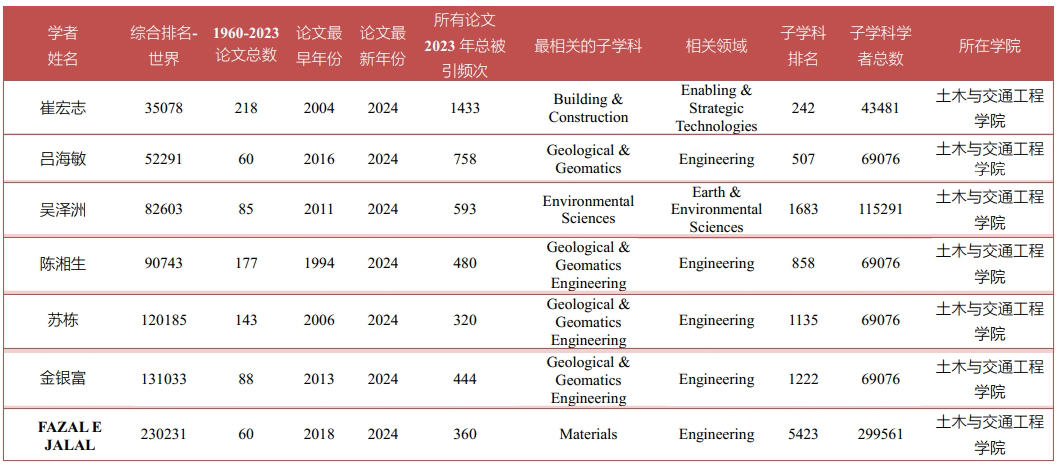 陈湘生院士、崔宏志教授、苏栋教授、金银富教授、吕海敏教授、吴泽洲副教授、Fazal E Jalal博士后入选“2023年度科学影响力排行榜”。