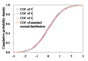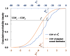 图2 颗粒生成的基本框架:(a)系数标准化;(b)随机生成的标准化系数分布;(c)系数转换;(d)随机生成的虚拟颗粒系数分布