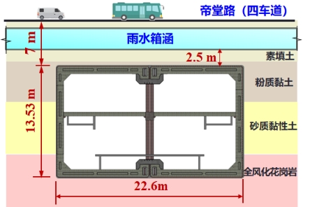 为了破解难题,由深圳大学土木与交通工程学院及未来地下城市研究院院长陈湘生院士担任项目负责人,深圳市地铁集团联合深圳大学、中铁装备和中国电建等单位组建科研团队,开展了广东省重点领域研发计划“现代工程技术”重点专项《繁华城区地铁暗挖车站关键技术》项目研究工作,深圳地铁12号线二期工程沙三站为该项目的示范性应用工程。沙三站位于帝堂路与沙井路交叉路口,为地下二层岛式车站,车站总长208.4米,标准段宽22.7米,有效站台宽13米。车站地处城市繁华城区,周边建筑物多,地下水充沛,地质条件复杂,且站址有一处埋深4.2米的新建暗涵。项目科研团队攻坚克难,针对沙三站研制了新型暗挖施工装备——世界上开挖面积最大(宽11.29米、高13.55米)的矩形顶管机“大禹掘进号”。装备由两台设备上下组合而成,采用多刀盘多螺机协同工作的姿态控制技术,实现了超高掌子面水土压力平衡和左右两次零间隙施工装备技术的重大突破。