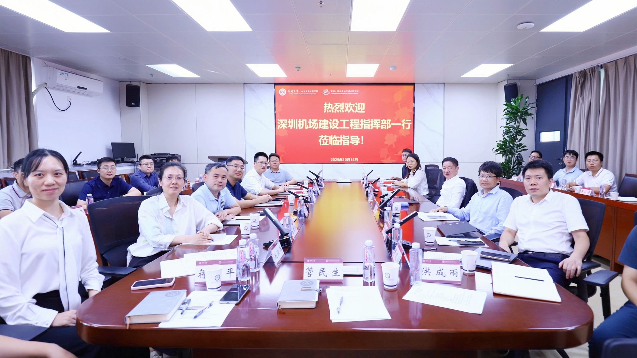 2025年10月14日下午,深圳机场建设工程指挥部常务副指挥长朱方海、副总工程师刘鸣秋等一行莅临深圳大学未来地下城市研究院开展调研交流。深圳大学土木与交通工程学院和未来地下城市研究院院长陈湘生院士、副院长包小华教授、研究院副院长苏栋教授以及相关专业教师参加此次座谈交流会,会议在粤海校区(南区)致理楼举行。