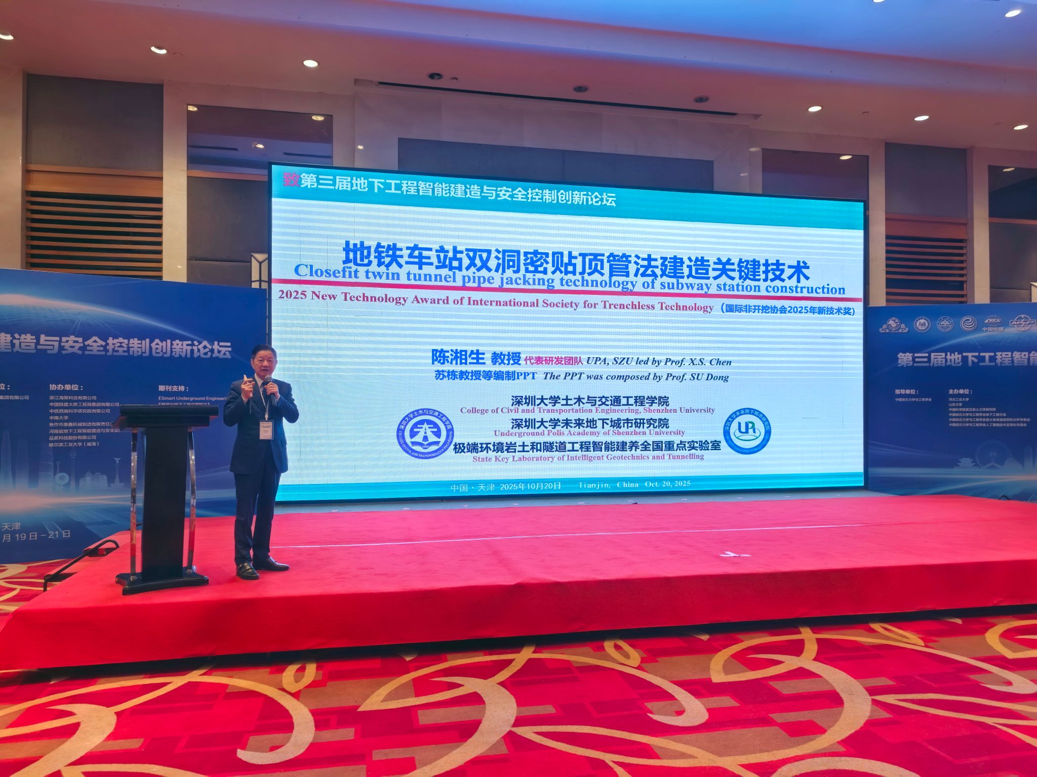 深圳大学未来地下城市研究院院长陈湘生院士率队参加了本次大会。作为大会的特邀主旨报告人,陈湘生院士代表团队在大会上作了题为“地铁车站双洞密贴顶管法建造关键技术”主旨报告。介绍了团队聚焦城市地铁车站施工难题,提出双洞密贴顶管法创新技术。通过对比传统方案,阐明其在成本、施工效率及环境影响方面的优势,最后对深圳大学土木与交通工程学院、未来地下城市研究院的概况和近年来的发展做了简要介绍。