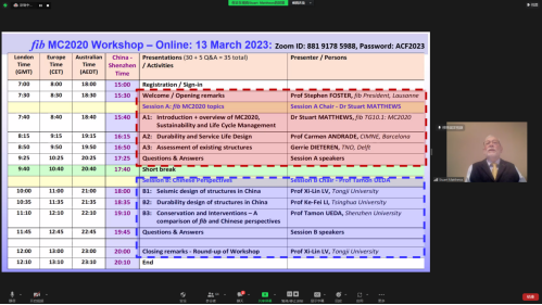 本次会议还包括一个为期半天的全线上研讨会,于2023年3月13日下午举行。该会议由亚洲混凝土协会(ACF) -深圳大学-香港理工大学和国际结构混凝土联合会(fib)三方联合主办,由国内外7位著名学者担任讲师,从不同角度介绍了混凝土耐久性设计方面的新理念和新实践。