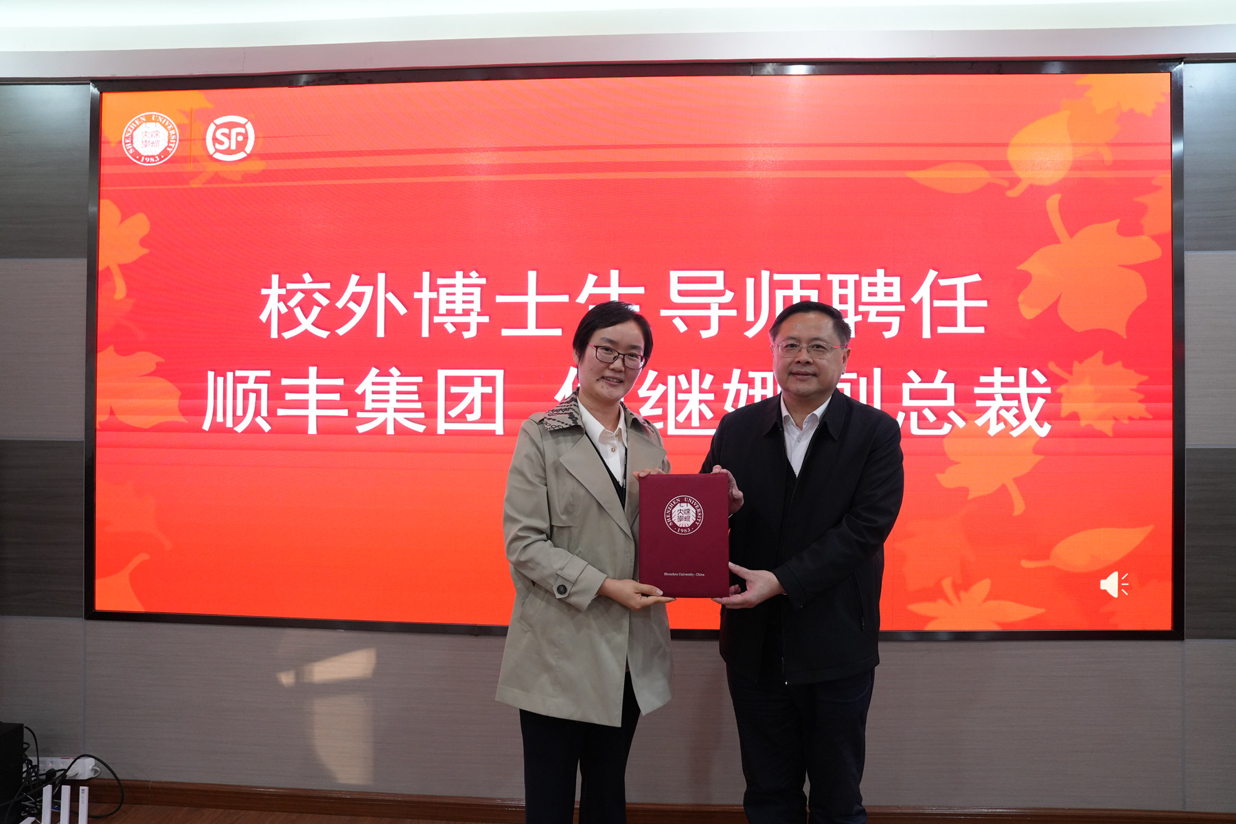 随后举行校外导师聘任环节,徐晨副校长向顺丰集团侯继娜副总裁颁发了校外博士生导师聘书。李伟文书记向顺丰集团运营模式算法总监黄一潇、场地规划总监孙肖肖、高级算法产品经理林嘉欣颁发了校外硕士生导师聘书。