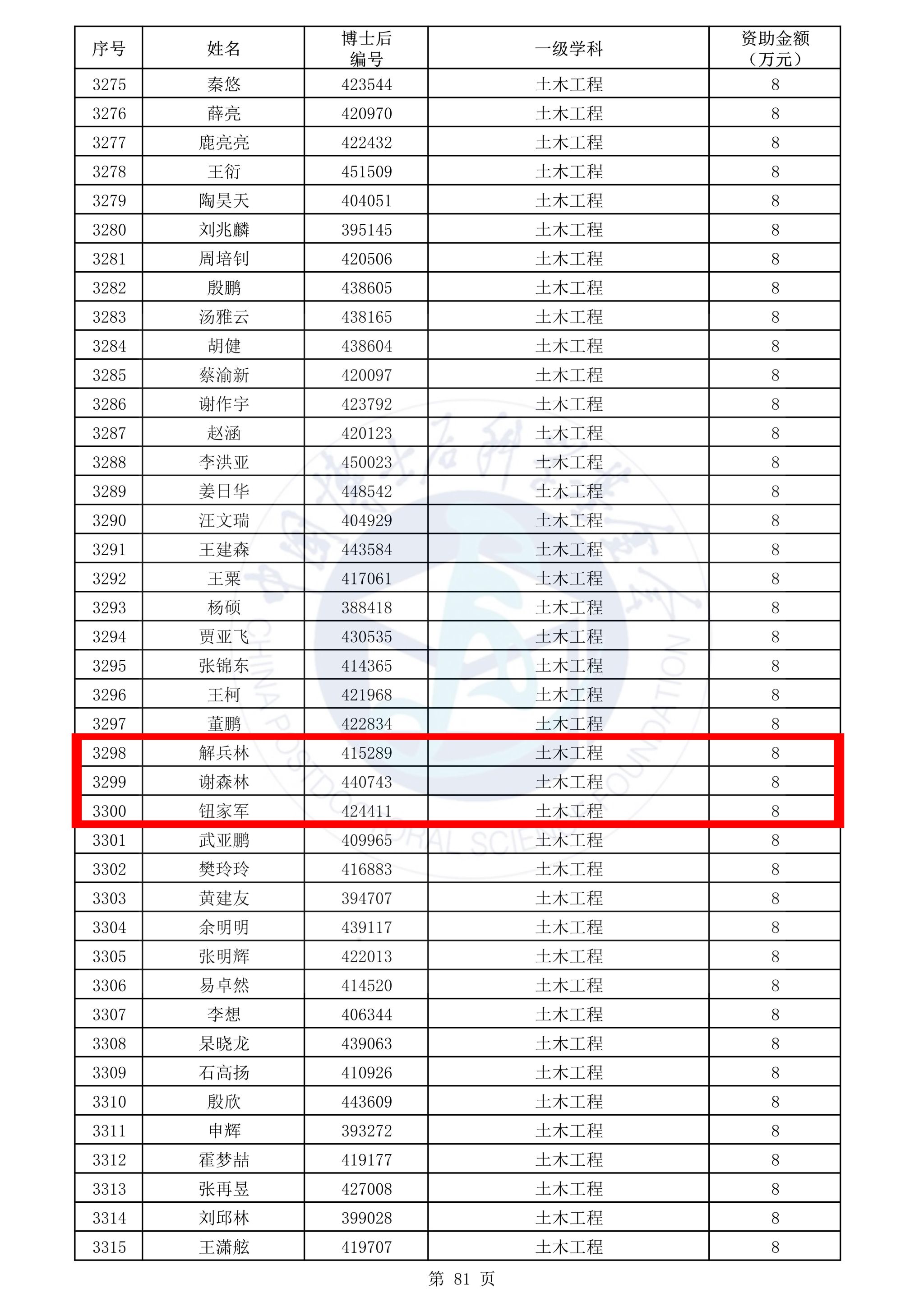 2025年11月25日,中国博士后科学基金会发布了《关于对2025年度中国博士后科学基金第78批面上资助拟资助人员名单进行公示的通知》,根据《中国博士后科学基金资助规定》和《中国博士后科学基金资助指南(2025年度)》,经专家评审,深圳大学未来地下城市研究院三位博士后解兵林博士、谢森林博士、钮家军博士获批第78批博士后面上资助!