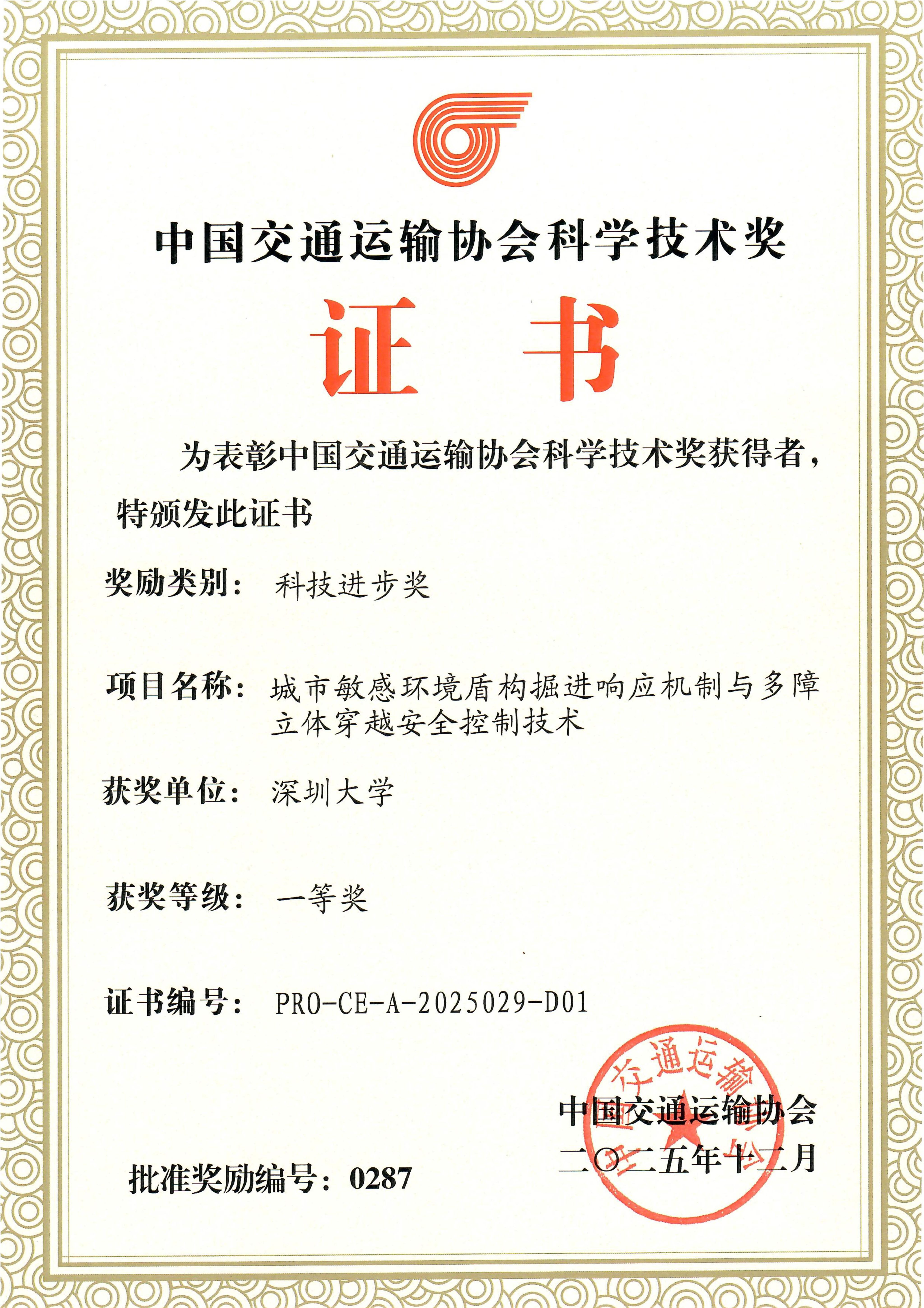 2026年3月29日,中国交通运输协会于北京召开了“2025年度中国交通运输协会科学技术奖表彰大会”。由深圳大学未来地下城市研究院副院长苏栋教授牵头,林星涛助理教授、沈翔助理教授、张睿骁博士后以及王雪涛客座研究员参与,深圳大学作为第一完成单位,联合中铁十四局集团有限公司等单位共同申报的《城市敏感环境盾构掘进响应机制与多障立体穿越安全控制技术》项目,荣获科技进步奖一等奖。该奖项是面向全国交通运输行业的综合性科技奖励,经国家科技部备案、交通运输部支持设立,其核心目的是奖励在交通运输领域科技进步中做出突出贡献的单位和个人,是衡量行业科技创新水平的重要标尺。