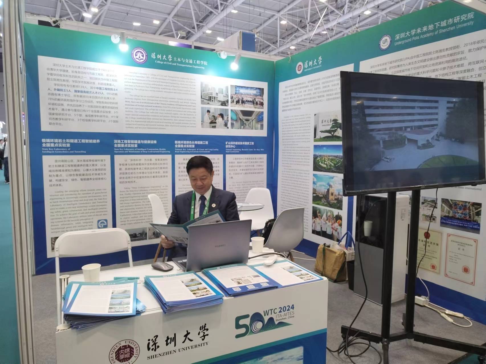深圳大学参与了大会高校联盟展区,展示深圳大学及土木与交通学院的办学规模、国家重点实验室以及未来地下城市研究院近年来研究的关键课题。展台内容十分丰富,吸引了很多业内同行、高校教授和学生前来交流。
