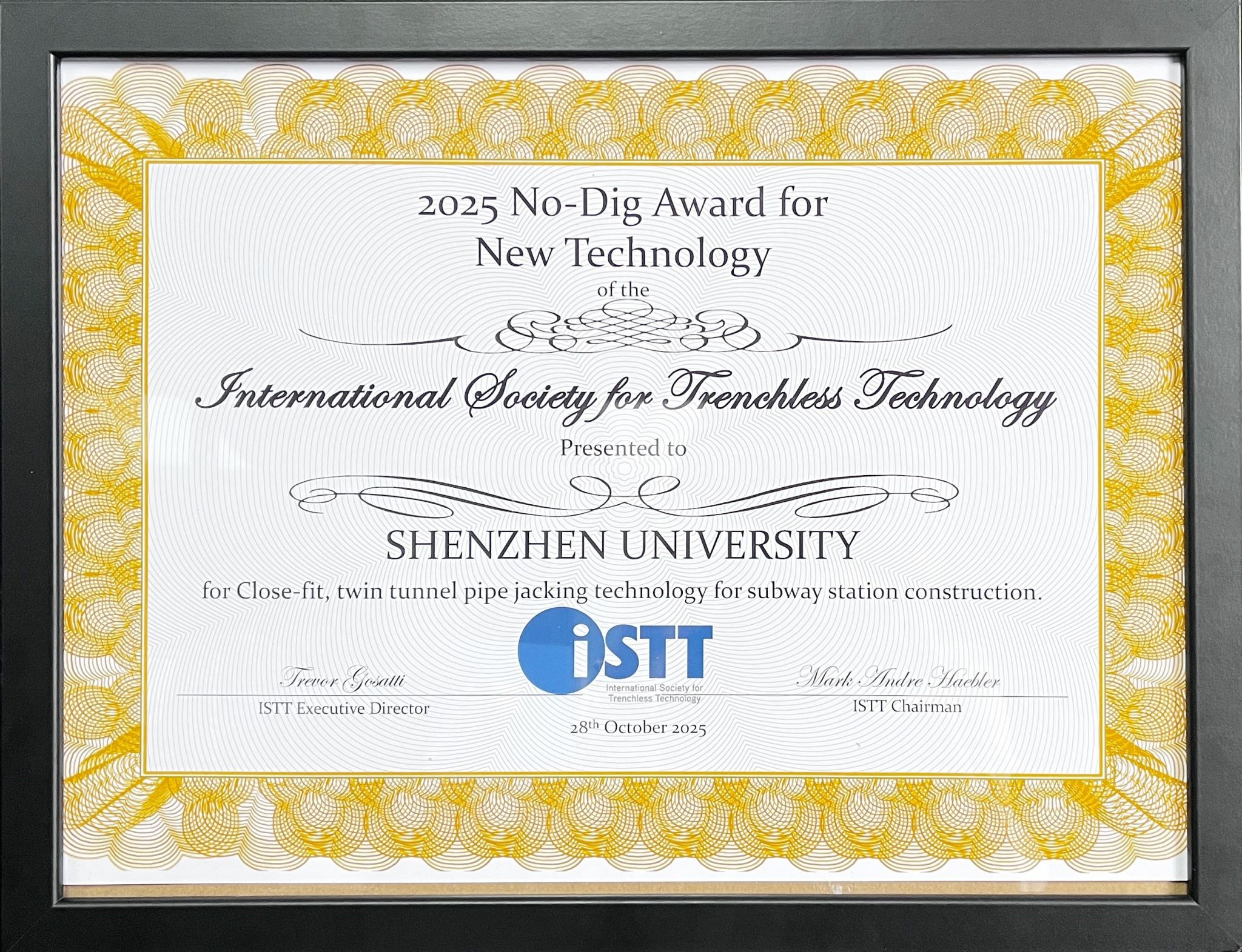 近日,国际非开挖技术协会(ISTT)公布并颁发了2025年度非开挖奖获得者(2025 ISTT No-Dig Award Winners),深圳大学未来地下城市研究院院长陈湘生院士领衔的“地铁地下车站双洞密贴顶管建造技术”(Close-fit, twin tunnel pipe jacking technology for subway station construction)获创新技术奖。这是该技术入选深圳大学2023年十大科技进展、2024年度中国非开挖杰出技术奖之后获得的又一荣誉。